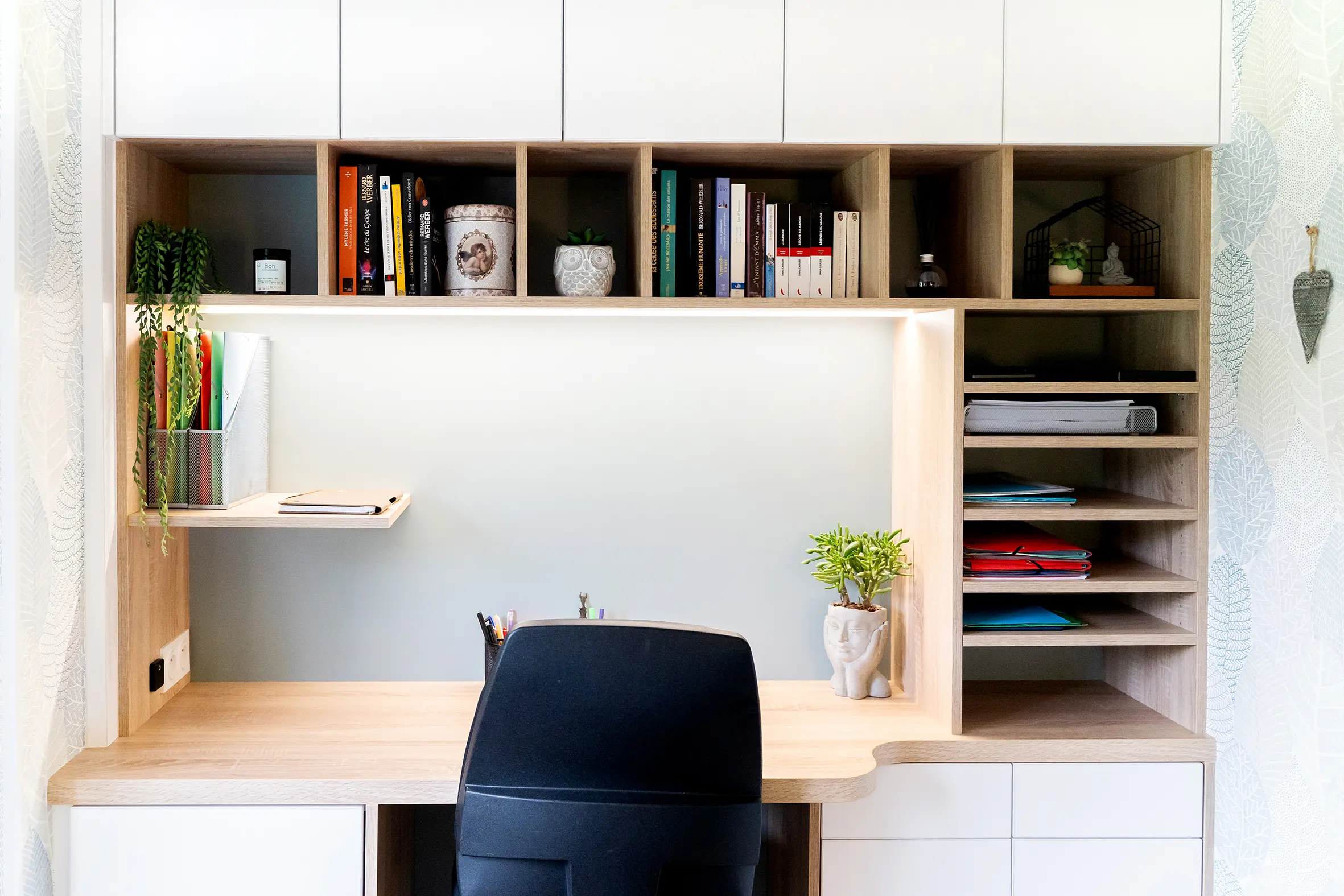 Nous réalisons des bureaux personnalisés, adaptés à vos besoins, à la configuration de la pièce et à votre style. Plans de travail, rangements, étagères, tiroirs et cloisons : chaque détail est étudié pour favoriser la productivité, le confort et l’ergonomie au quotidien.